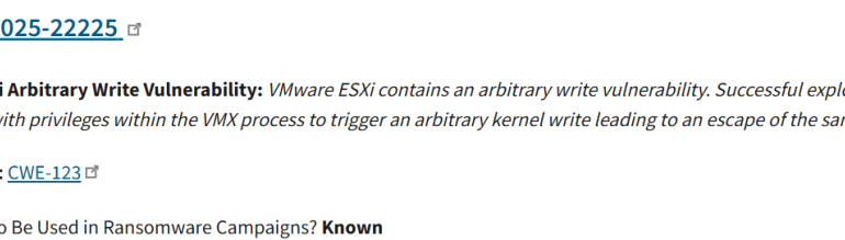 Ransomware groups now exploit VMware ESXi vulnerability CVE-2025-22225, patched by Broadcom in March 2025. The U.S. Cybersecurity and Infrastructure Security Agency (CISA) confirms that ransomware...